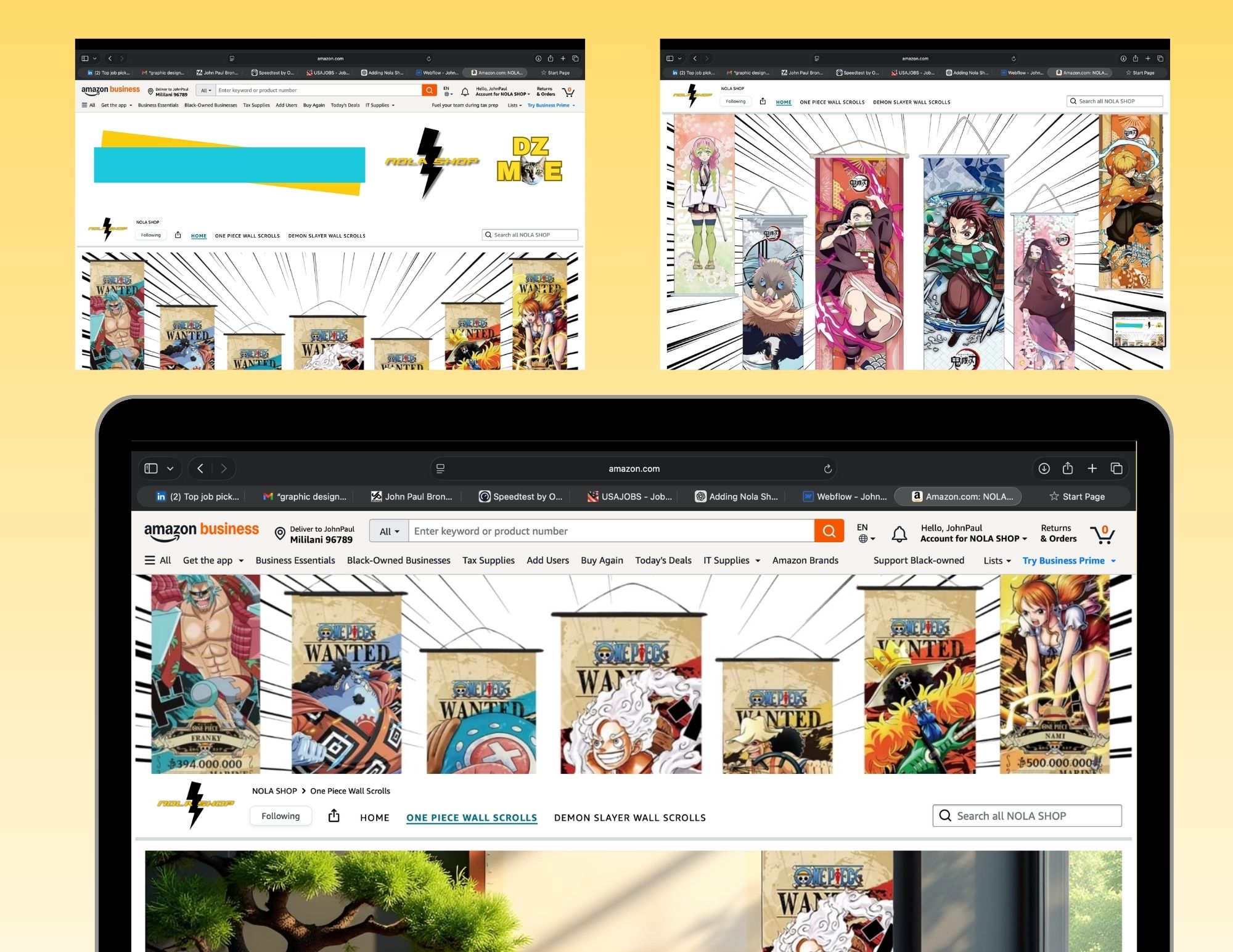 Nola Shop is an anime merchandise e-commerce brand I founded and designed from the ground up, specializing in premium wall scrolls and decor for anime fans. The project involved building a complete brand ecosystem — from identity design and product visualization to marketplace optimization and digital marketing. My goal was to create a visually compelling storefront that attracts fans while optimizing the shopping experience for conversion across platforms such as Amazon and Shopify.